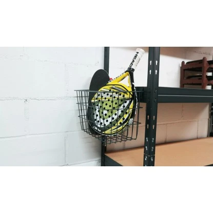 Der Rivet Stahlgitter Korb Anthrazit Grau wird an die längs oder Quertraversen der Rivet Regale aufgehängt.