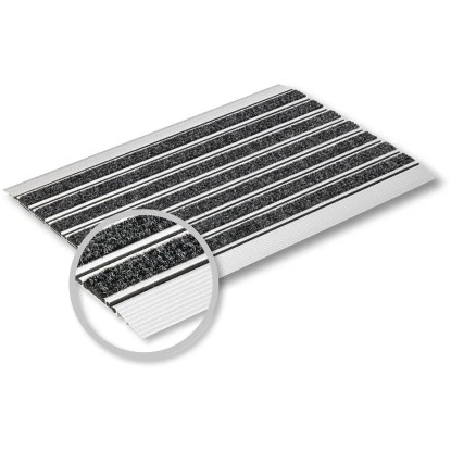 Wie der Name vermuten lässt, handelt es sich bei der Fußmatte Elegant Mat um eine besonders hochwertige und elegante Türmatte. Sie nimmt feinen wie auch groben Schmutz sehr gut auf, ist extrem strapazierfähig und hält jeder Witterung stand. Die hochwertige Anlaufkante des Fußabtreters aus Aluminium sorgt für ein angenehmes Betreten der Matte.
