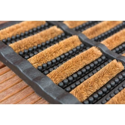 Das Besondere an der Rimini ist ihr Materialmix aus Gummi und Kokos. Die Gumminoppen streifen den groben Schmutz ab, während die Kokosborsten gleichzeitig auch den feinen Schmutz aufnehmen. Der Fußabstreifer ist rutschfest und hält jeder Witterung stand.