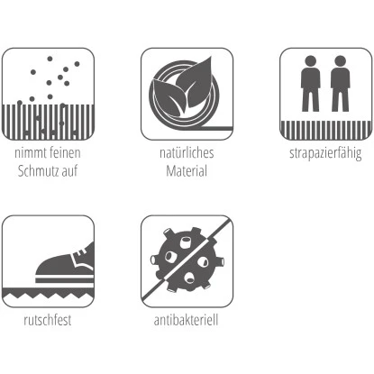 Die Coco Style Fußmatten nehmen feinen Schmutz gut auf und sind dank ihres mit Vinyl beschichteten Rückens rutschfest. Die Nutzschicht der ASTRA Matte besteht zu 100 % aus dem natürlichen Material Kokos und sie ist antibakteriell.