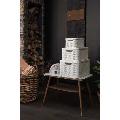 Das universell einsetzbare Best Freizeitmöbel Aufbewahrungsboxen Curver Style 3-er Set Creme S + M + L mit Deckel lässt sich in seiner angesagten Rattan-Struktur hervorragend in Ihr Ambiente integrieren. Die Box in der Größe S besitzt die Maße 14,2 cm x 29,1 cm x 19,8 cm und hat ein Fassungsvermögen von 7 l, M umfasst eine Größe von 18,7 cm x 39, 7 cm x 29 cm und insgesamt 18 l, Größe L besteht aus 24,8 cm x 44,5 cm x 33,3 cm und fasst 30 l. Sie verleihen Ihrer Dekoration mit dem unifarbenen Rattan-Design eine einzigartige und erstklassige Haptik. Die kleinen Ablageboxen können auf Regalen, Tischen, in Schubladen und vielem mehr eingeordnet werden.