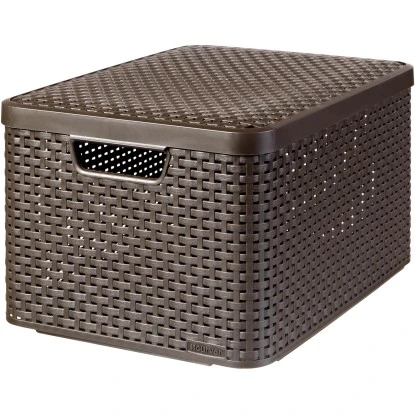 Das universell einsetzbare Best Freizeitmöbel Aufbewahrungsboxen Curver Style 3-er Set Dunkelbraun L mit Deckel lässt sich in seiner angesagten Rattan-Struktur hervorragend in Ihr Ambiente integrieren. Die Boxen in der Größe S besitzen jeweils die Maße 24,8 cm x 44,5 cm x 33,3 cm und haben pro Kiste ein Fassungsvermögen von 30 l. Sie verleihen Ihrer Dekoration mit dem unifarbenen Rattan-Design eine einzigartige und erstklassige Haptik. Die kleinen Ablageboxen können auf Regalen, Tischen, in Schubladen und vielem mehr eingeordnet werden.