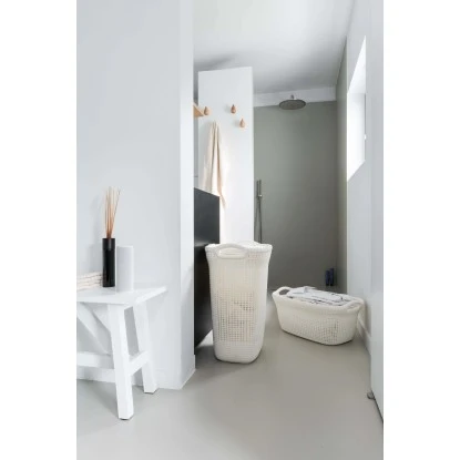 Die Box verfügt über einen großen, leicht zugänglichen Deckel, der sich in einem Winkel von 270° öffnet, und zwei handliche Henkel für einen vereinfachten Transport. Der Korb ist mit zwei leicht zu haltenden Griffen für eine bestimmte Auswahl an Trageweisen ausgestattet, die den Waschtag erleichtern. Beide Formen haben eine flache Innenfläche, die mit dem exklusiven Strickmuster auf der Außenseite der Produkte verbunden ist und dem perfekten Duo eine trendige und gemütliche Optik und Haptik verleiht.