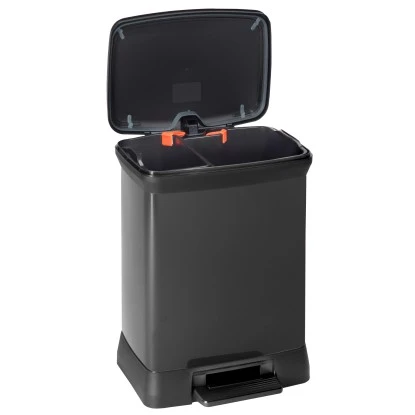 Der Treteimer Metallics Duo in hochwertiger Metall-Optik überzeugt durch leichte Handhabung und Funktionalität. Dank zweier getrennter und herausnehmbarer Inneneimer (10 l + 18 l) ist die Abfalltrennung äußerst einfach. Der Kunststoffeimer ist rostfrei, resistent gegen Kratzer, Beulen und Fingerspuren und kann leicht gereinigt werden. Dank praktischem Tretmechanismus lässt sich der Eimer – mittels stabilen Fußpedals – freihändig öffnen und schließen.