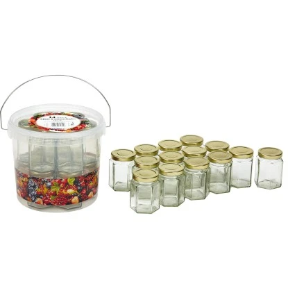 5,7 l Kunststoffeimer mit Obstdekoration. Im Lieferumfang sind ebenfalls 14 Marmeladengläser mit Deckel und einem Fassungvermögen von 195 ml enthalten.