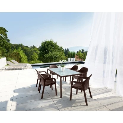 Der Esstisch von Lechuza besticht mit seinen Rahmen in attraktiver Flechtstruktur und Glasplatte aus Einscheibensicherheitsglas. Dabei wurde das Glas von unten blickdicht lackiert. In zwei gegenüberliegenden Tischbeinen sind Stellschrauben integriert, die auch auf unebenem Boden für einen stabilen Stand sorgen.