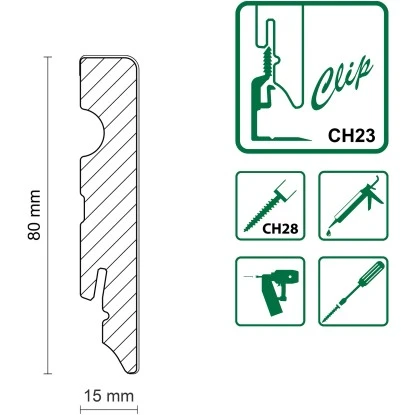 Die einfache Befestigung mittels passendem Clipholder CH23 ermöglicht eine schnelle und saubere Installation. Somit wird die Oberfläche der Leiste nicht durch Schrauben oder Nägel zerstört. Diese Sockelleiste eignet sich ideal für den Einsatz in verschiedenen Wohnbereichen und Räumen, um eine saubere und ansprechende Abdeckung zu gewährleisten.