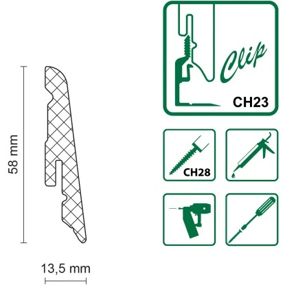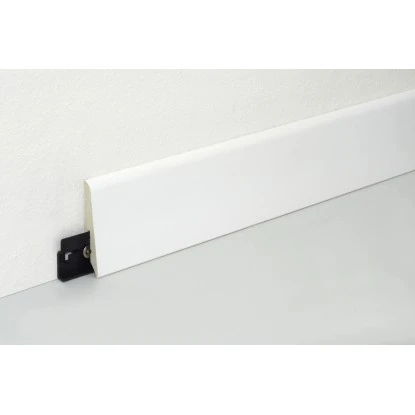 Diese FN Neuhofer Sockelleiste besteht aus PS und hat eine weiße, glatte Oberfläche. Die einfache Befestigung der Leiste mittels passendem Clipholder CH23 funktioniert sauber und schnell. Somit wird die Oberfläche der Leiste nicht durch Schrauben oder Nägel zerstört.