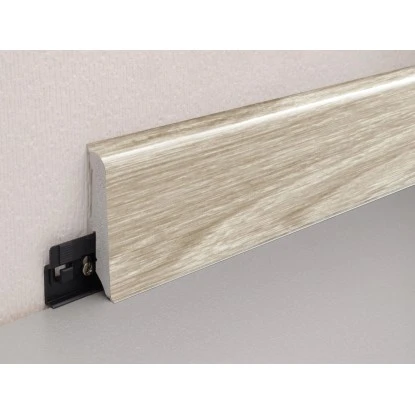 Diese FN Neuhofer Sockelleiste besteht aus PVC und ist mit Dichtlippen zu Boden und Wand ausgestattet. Die Oberfläche ist in Holzdekor bedruckt. Die einfache Befestigung der Leiste mittels passendem Clipholder CH23 funktioniert sauber und schnell. Somit wird die Oberfläche der Leiste nicht durch Schrauben oder Nägel zerstört.