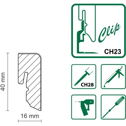 Diese FN Neuhofer Sockelleiste besteht aus Fichte oder Kiefer und ist mit Starkfolie überzogen. Die einfache Befestigung der Leiste mittels passendem Clipholder CH23 funktioniert sauber und schnell. Somit wird die Oberfläche der Leiste nicht durch Schrauben oder Nägel zerstört.