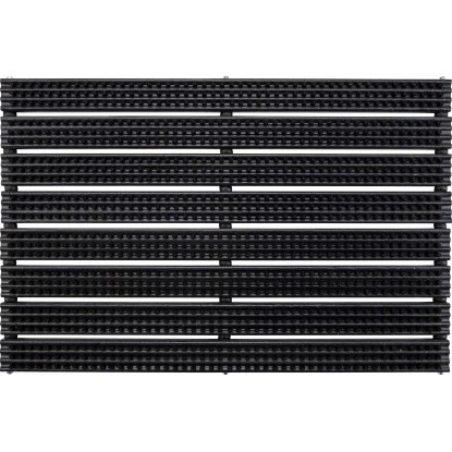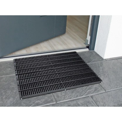 Die schwarze Fußmatte mit einem Maß von 38,5 cm x 59 cm eignet sich ideal zur Schuhreinigung für den Außenbereich durch ihre ausgeprägten und hohen Borsten. Ihr Obermaterial besteht aus 100 % Polypropylen mit einem rutschfesten und stabilisierten Rücken.