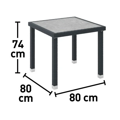 Der Gartentisch Marnoo begeistert durch eine Tischplatte in Zement-Optik und ist mit einem schwarzen, geflochtenen Gestell ausgestattet. Er hat eine quadratische Form und findet seinen Platz auf dem Balkon, der Terrasse sowie im Garten. Hergestellt wird der Tisch mit einem Aluminium-Gestell mit handgeflochtenem Polyrattan sowie einer Tischplatte aus SPC. Durch sein geringes Gewicht ist er leicht zu verschieben und wegzuräumen. Zudem punktet der Gartentisch mit pflegeleichten Eigenschaften. Seine Maße betragen 74 cm x 80 cm x 80 cm (H x B x T). Geeignet ist das Gartenmöbel für vier Personen.