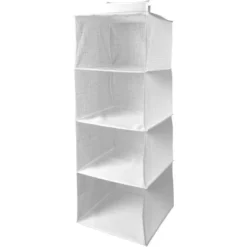 Die Hängeaufbewahrung mit einem Maß von 108 cm x 33 cm x 33 cm (H x B x T) und vier tiefen Fächern bietet verschiedensten Textilien wie Pullovern, T-Shirts, Handtüchern und ähnlichem eine platzsparende Aufbewahrungsmöglichkeit. Dank der einfachen Aufhängevorrichtung mit Klettverschluss kann sie problemlos und schnell im Schrank oder an einer anderen Kleiderstange platziert werden. Das Regal inklusive der Aufhängevorrichtung hat eine Gesamthöhe von 108 cm. Die Hängeaufbewahrung besteht aus pflegeleichtem, strapazierfähigem Kunststoff (PEVA) und ist abwaschbar. Die Böden der Fächer sind verstärkt, sodass ein Durchhängen der Kleidung oder anderer Textilien verhindert wird.