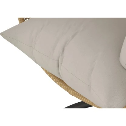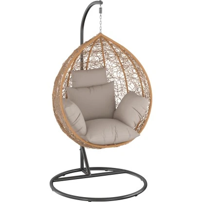 Hergestellt aus einem Kunststoffgeflecht, zeichnet sich der Hängesessel durch pflegeleichte Eigenschaften aus. Dazu ist das Material witterungsbeständig und wasserabweisend. Um Ihnen ein angenehmes Sitzen zu bieten, verfügt der Sessel über dekorative und gemütliche Auflagen sowie Kissen.