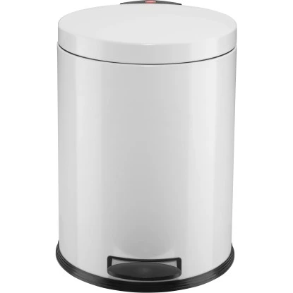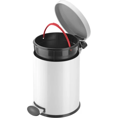 Der formschöne und funktionelle Abfalleimer verfügt über ein Gehäuse und flachen Deckel aus korrosionsfest beschichtetem Stahlblech in Weiß, sowie eine außenliegende Tretmechanik. Das Design-Deckelscharnier mit praktischem Kunststoff-Tragegriff sowie das funktionelle Design-Fußpedal ermöglichen eine komfortable Bedienung. Ist der Abfalleimer voll, so kann er bequem durch den herausnehmbaren, schwarzen Kunststoff-Inneneimer entleert werden. Darüber hinaus verfügt er über einen Kunststoff-Bodenring inkl. 3 Anti-Rutsch-Füßen in der Farbe Schwarz.