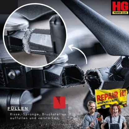 Der HG Power Glue Klebstoff – Die Schweißnaht aus der Flasche Der Power Glue ist ein Industrieklebstoff, der in Kombination mit dem Granulat eine extrem feste und belastbare Klebeverbindung erzeugt. Die Klebenaht ist wasserfest, hitze- und kältebeständig und hält UV-Strahlung stand. Mit der praktischen 4-fach Anwendung können Sie kleben, füllen, formen und verstärken. Dabei hält der Alleskleber auf 93 % aller Materialien.