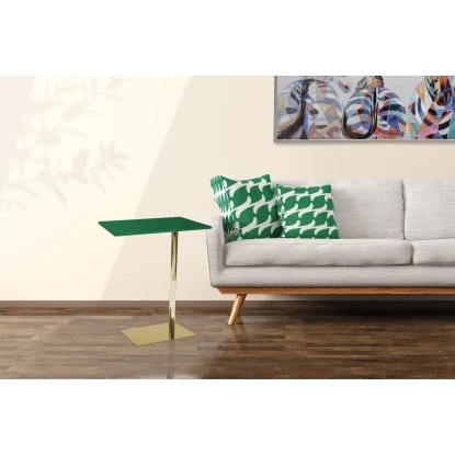 Der Kayoom Beistelltisch Lucy macht in jedem Wohnraum eine gute Figur. Das stabile, goldene Gestell mit grüner MDF-Platte ist luxuriös und gleichzeitig zeitlos. Standfuß und Tischplatte sind parallel zueinander gehalten und integrieren sich mit ihrer rechteckigen Form problemlos in jede Einrichtung. Setzen Sie den Design-Tisch als Deko-Element ein oder nutzen Sie ihn als praktische Ablagemöglichkeit. Durch die glatte Oberfläche ist der Tisch pflegeleicht und einfach zu reinigen.