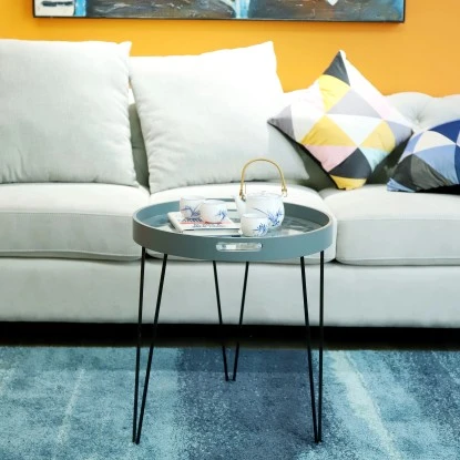 Platzieren Sie einen echten Eyecatcher in Ihrem Zuhause und holen Sie sich den Kayoom Beistelltisch River im Vintage-Stil. Mit dem handgeschnitzten Muster in der Tischplatte und dem edlem Graublau sticht der runde Beistelltisch direkt ins Auge. Schönen Glanz erhält das Muster durch die eingesetzte Glasplatte. Das stabile MDF-Material der Tischplatte ist matt lackiert und besticht durch seine stillvolle Farbe. Gestützt wird die Platte durch leicht zur Seite abgespreizte pulverlackierte Tischbeine aus Metall. Die schwarzen Tischbeine setzten dabei einen stillvollen Kontrast zu der graublauen Tischplatte.