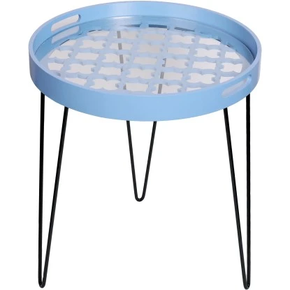 Platzieren Sie einen echten Eyecatcher in Ihrem Zuhause und holen Sie sich den Kayoom Beistelltisch River im Vintage-Stil. Mit dem handgeschnitzten Muster in der Tischplatte und dem edlem Hellblau sticht der runde Beistelltisch direkt ins Auge. Schönen Glanz erhält das Muster durch die eingesetzte Glasplatte. Das stabile MDF-Material der Tischplatte ist matt lackiert und besticht durch seine originelle Farbe. Gestützt wird die Platte durch leicht zur Seite abgespreizte pulverlackierte Tischbeine aus Metall. Die schwarzen Tischbeine setzten dabei einen stillvollen Kontrast zu der hellblauen Tischplatte.