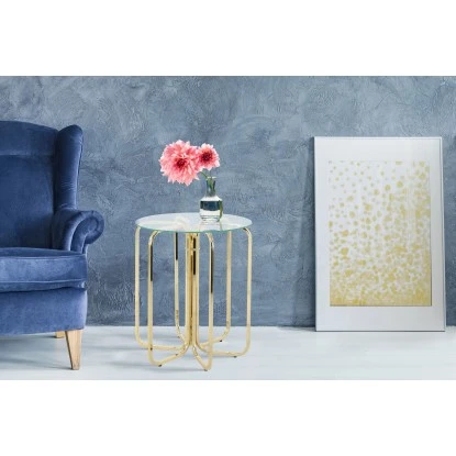 Der hochwertige Couchtisch ist in einem edlen Gold gehalten und misst einen Durchmesser von 45 cm und einer Höhe von 55 cm. Mit modernen Einrichtungen sowie Luxus-Einrichtungen oder dem orientalischen Stil lässt sich der Beistelltisch besonders gut kombinieren.