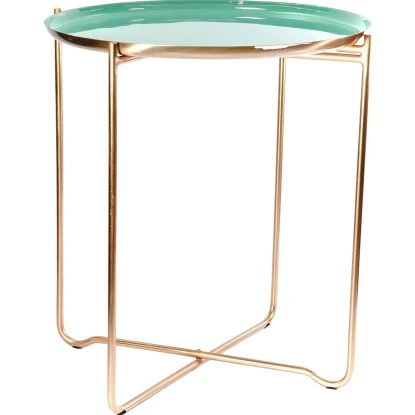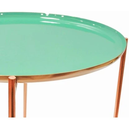 Der Beistelltisch Yvette in Grün-Kupfer ist ein schöner, rund gehaltener Beistelltisch. Die hohe, nach außen gewölbte Kante dieses Beistelltisches verhindert das Herunterkullern von Gegenständen und verleiht dem Tisch gleichzeitig seine exklusive Form. Durch die runde Form und das dezente Design lässt sich der Tisch harmonisch in Ihre Wohneinrichtung integrieren.