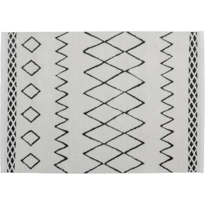Das moderne schwarze Ethno-Muster verziert den hellen Teppich ideal und wird durch die dekorativen und weichen Fransen an den Teppichenden noch unterstrichen. Die schlichten Farben in aufregendem Design aus geometrischen Formen werten nicht nur moderne Einrichtungen auf, sondern auch klassische oder rustikale Wohnstile. Statten Sie Ihre Wohnräume mit Ihrem neuen Hochflorteppich aus und schaffen Sie eine gemütliche Atmosphäre, egal ob in Wohnzimmer, Schlafzimmer oder Eingangsbereich.