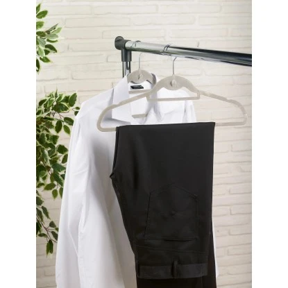 Der Kleiderbügel bietet durch seine stoffschonende und rutschhemmende Beflockung auch empfindlichen Kleidungsstücken eine ideale Aufbewahrung. Selbst Kleidungsstücke aus Seide verrutschen nicht oder fallen vom Bügel.