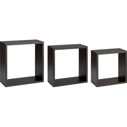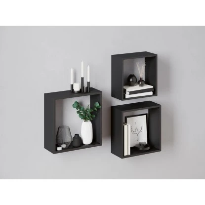 Für stilvolle Wandgestaltungen in Ihrem Zuhause eignet sich das 3-teilige Kubus-Set Meddon. Es stellt Ihnen drei unterschiedlich große Kubus-Regale zur Verfügung, die ein quadratisches Design besitzen. Sie eignen sich zur Platzierung von Kleinpflanzen, Bilderrahmen oder anderen Dekoartikeln. Gefertigt sind die Wandregale aus hochwertigen MDF-Holzwerkstoffen. Dank der beschichteten Oberflächen gestaltet sich die Reinigung denkbar einfach.