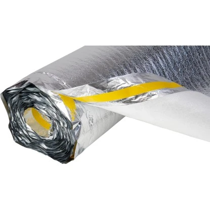 Die PE-Unterlage mit aufkaschierter Aluminiumschicht ist die ideale Kombination aus Dämmung und Feuchteschutz. Die Überlappung der einzelnen Bahnen kann direkt mit dem integrierten Klebestreifen verbunden werden.