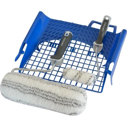 Im Lieferumfang befindet sich ein Fassadenroller, der eine Breite von 27 cm besitzt und ideal für grob strukturierte Flächen ist. Er verfügt über eine Florhöhe von 18 mm und besteht aus Polyamid Graufstreif- und Teflonfasern. Der dazu gehörige Bügel hat eine Länge von 25 cm und ist mit einem 2-Komponenten-Griff ausgestattet. Der Wandroller ist 10 cm breit und eignet sich hervorragend für schwer zugängliche Stellen. Er besitzt eine Florhöhe von 12 mm und ist mit Polyamid Endlos- und Teflonfasern beschichtet. Sein Bügel hat eine Länge von 28 cm. Das Abstreifgitter mit einem Maß von 27 cm x 33 cm und ist aus grauem Kunststoff gefertigt. Als besonders praktisch erweist sich, dass es in den Farbeimer eingehängt werden kann.