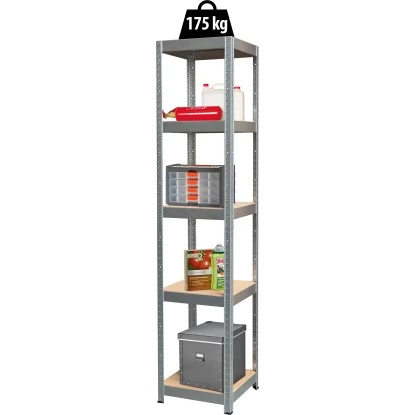 Das Metall-Schwerlast-Steckregal eignet sich für die Aufbewahrung unterschiedlichster Gegenstände im Hauswirtschaftsraum, in der Küche oder auch in der Werkstatt. Es besteht aus verzinktem Metall. Mit seinem modernen Industriedesign kann das Regal somit auch in Wohnräumen genutzt werden. Die Maße sind 180 cm x 40 cm x 40 cm (H x B x T). Das Metallregal besitzt fünf höhenverstellbare Regalböden aus Holz, die bei gleichmäßiger Gewichtsverteilung jeweils bis zu 175 kg tragen können. Dank des praktischen Stecksystems ist es einfach und ohne viel Zeitaufwand zu montieren.