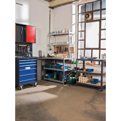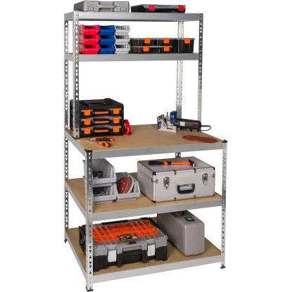 Die Montage ist dank simplem Stecksystem binnen weniger Minuten ohne Zuhilfenahme von Werkzeugen zu erledigen. Dank zweifachem Verbindungssystem und verzinkten Profilen ist das Stufenregal robust und belastbar. Zusätzlich ist es mit insgesamt acht Füßen aus Kunststoff ausgestattet. Sechs Füße dienen dem Abschluss der verzinkten Profile zum Boden. Zwei weitere Kappen dienen als Kantenschutz für die zur Arbeitsfläche gelegenen Profile.