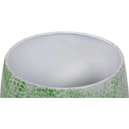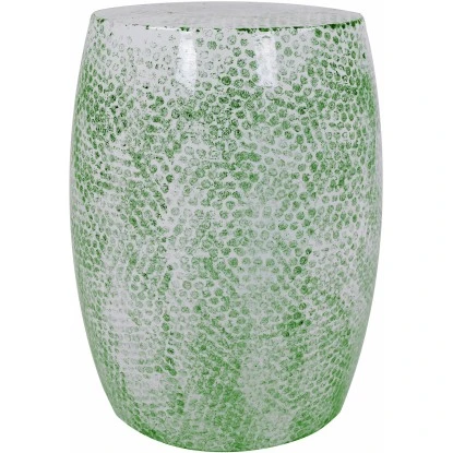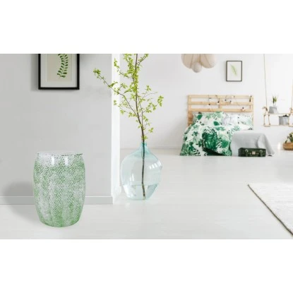 Der kurvige Hocker in Fass-Form wirkt elegant und kommt besonders mit modernen Möbelstilen gut zur Geltung. Der attraktive Metallhocker ist weiß gefärbt und besticht durch die dekorativen grünen Tupfer, die die besondere Optik unterstreichen und jedes Produkt zu einem einzigartigen Unikat machen. Ob als Sitzhocker oder als Beistelltisch – der Hocker ist vielfältig einsetzbar und macht nicht nur im Wohnzimmer, sondern auch im Schlafzimmer oder Flur eine gute Figur. Auch im Außenbereich kann der stabile Hocker aus robustem Eisen genutzt werden. Die leicht abwischbare Oberfläche lässt sich einfach reinigen und hält auch Regenwetter stand. Mit dem Metallhocker setzen Sie Akzente in Ihrem Wohnbereich oder im Garten und schaffen einen wahren Hingucker.