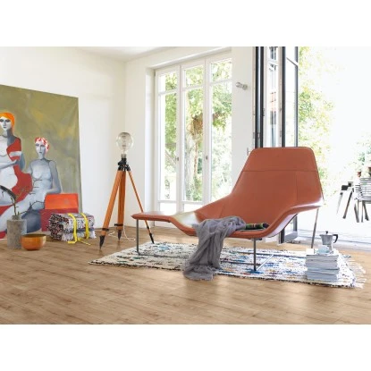 Der Bodenbelag ist mit einem Klicksystem ausgestattet, das die Funktion des Klebstoffs ersetzt und für ausreichend Halt der einzelnen Paneele sorgt. Dies ermöglicht Ihnen eine besonders saubere Verarbeitung des Bodenbelags.