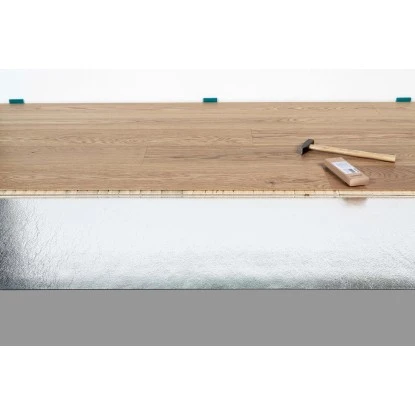 Aufgrund des Eigengewichts von 1,4 kg/m² bei einer Stärke von gerade einmal 1,8 mm liefert die Laminatunterlage eine ideale Dämmung. Durch die Aluminium-kaschierte Oberseite ist keine zusätzliche Dampfbremse nötig, weshalb das Verlegen deutlich schneller und einfacher ist. Dafür muss der Bodenschutz lediglich verlegt werden, ohne ihn zu kleben. Im Paket enthalten sind 7,5 m² der Parador Parkettunterlage in den Maßen 750 cm x 100 cm.