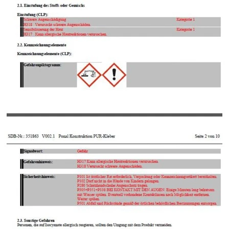 Anwendung: Geeignet sind alle feuchtigkeitsdurchlässigen Untergründe, wie z. B. Holz, Gipskarton, Putz, Beton o.Ä. Nur staub-, fettfreie und trockene Materialien verkleben. Je nach Anwendung PU Kleber strangförmig oder ggf. mit Leimkamm gleichmäßig flächig verteilen. Innerhalb der offenen Zeit von 6 Minuten sind die Teile zu fügen und zu pressen.