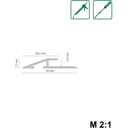 Dieses Rampenprofil fit-fix 09 elox. Alu 44 x 75 x 900 mm Silber ist eloxiert und dient als Rampenprofil für LVT-Bodenbeläge. Es ist geeignet für Bodenbeläge von 5 – 5,5 mm Stärke.