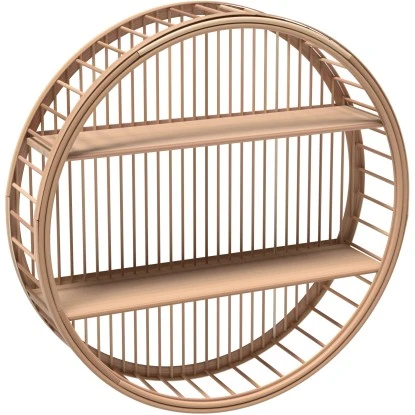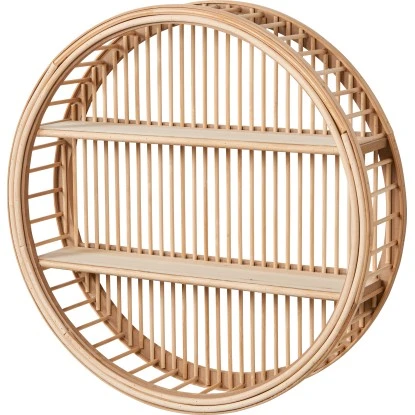 Das kleine runde Holzregal ist aus natürlichem Rattangeflecht gefertigt und in trendiger Wagenradform designt. Zwei feste Regalböden bieten Platz für verschiedene, kleine Wohndeko. Jeder Boden stellt eine maximale Tragkraft von 1,5 kg zur Verfügung. Vorgesehen ist das Regal zur wandhängenden Montage.