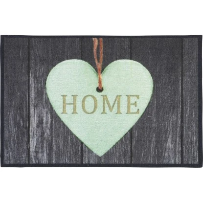Die Sauberlaufmatte Herz Home nimmt Schmutz und Feuchtigkeit von Ihrer Schuhsohle auf. Das Obermaterial besteht aus strapazierfähigem Polyamid, welches durch abriebfeste Eigenschaften überzeugt. Die Rückseite ist mit einer rutschhemmenden Beschichtung versehen und sorgt so für ein sicheres Trittgefühl. Der Hintergrund der Fußmatte ist Anthrazit. In der Mitte ist ein Herz in Mintgrün, welches mit der Aufschrift Home punktet. Die Maße betragen 40 cm in der Breite und 60 cm in der Tiefe. Die Sauberlaufmatte lässt sich bei bis 30 °C in der Waschmaschine reinigen.