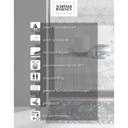 Die Sauberlaufmatte Manhattan Pusteblume in Grau-Rose aus der Schöner Wohnen-Kollektion schützt nicht nur den Boden vor Schmutz und Nässe sondern überzeugt auch durch ihr unvergleichbares brilliantes Motiv und Farben. Dank ihrer weichen Oberfläche geben die Säuberläufer auch barfuß ein angenehmes Gefühl unter den Füßen und eignen sich somit für jeden Wohnbereich. Egal ob im Flur, in der Küche, im Bad oder vor der Haustür, die neuen Fußmatten aus der Schöner Wohnen-Kollektion passen sich optimal Ihrer Umgebung an. Sie sind bei 30° in der Maschine waschbar.