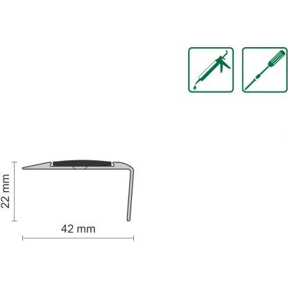 Dieses L-förmige Treppenprofil simple-fix 26G elox. Alu Schraubbar 42 x 22 x 1350 mm Silber eignet sich besonders als Treppenkantenschutz. Dank der Herstellung aus Aluminium erhält man ein stabiles, wasserfestes und auch dekoratives Gestaltungselement. Die Befestigung erfolgt durch Schrauben, anschließend wird ein Gummistreifen als Anti-Rutsch-Streifen aufgebracht