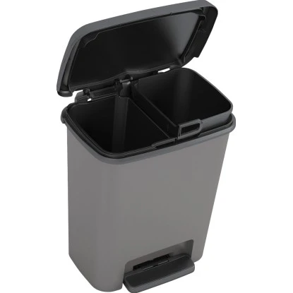 Der Compatta Recycling Mülleimer mit Tretpedal von KIS passt perfekt zu allen Bedürfnissen. Er steht dank rutschfester Gummierung an der Unterseite stabil und benötigt dabei nur geringe Stellfläche. Das hohe Fassungsvermögen wird verteilt auf zwei herausnehmbare Inneneimer mit jeweils etwa 11 Litern zur komfortablen Mülltrennung. Die Griffe an den Inneneimern ermöglichen eine leichte Handhabung und Reinigung.