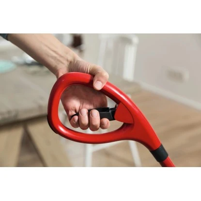 Den Sprühtank ganz leicht abnehmen und mit einem Universalreiniger befüllen und wieder einsetzen. Beim Betätigen des Hebels wird ein feiner Sprühnebel auf den Boden gesprüht – wischen und fertig. Ein Eimer ist somit überflüssig.
