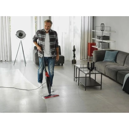 Der Bodenreiniger ist einfach zu bedienen und ermöglicht längere Arbeitsintervalle. Weiterhin schont der Helfer den Rücken und Sie sparen Kraft während der Benutzung. Dank des hochwertigen Mikrofaserbezugs ist die Fläche nach dem Reinigen streifenfrei. Die leistungsstarken Kunstfasern lösen in Kombination mit Wasserdampf selbst hartnäckigen Schmutz und liefern so ein besonders gründliches Ergebnis. Die Wischbezüge können bei 60 °C einfach in der Waschmaschine gereinigt werden. Das 7 m lange Kabel bietet einen großzügigen Bewegungsfreiraum für größere Räume.