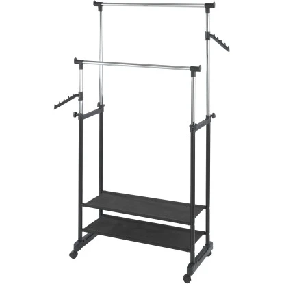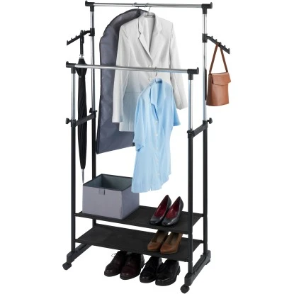 Kleidungsstücke können auf zwei in Höhe und Breite verstellbaren Stangen aufgehangen werden, während sich im unteren Bereich eine praktische Ablage für Schuhe befindet.