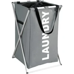 Der moderne Wäschesammler Uno in frischem, trendigem Grau und weißem „Laundry“-Schriftzug bringt Stil ins Bade- oder Schlafzimmer.